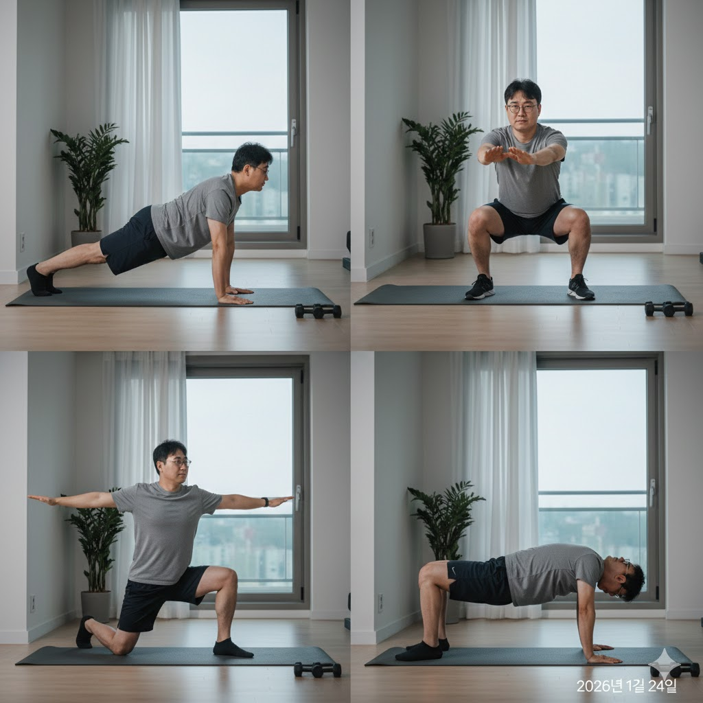 40대 다이어트의 핵심은 바로 '근력 운동'입니다. 줄어든 근육량을 다시 늘려 기초대사량을 높여야 요요 없는 다이어트가 가능합니다. 거창한 운동기구 없이 맨몸으로 충분합니다.